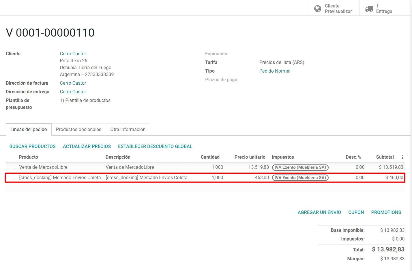 De manera automática se agrega el costo de envío que pagó el cliente en la venta para luego ser facturado. IMPORTANTE: Si la venta es con envío gratis la línea se crea con precio cero.