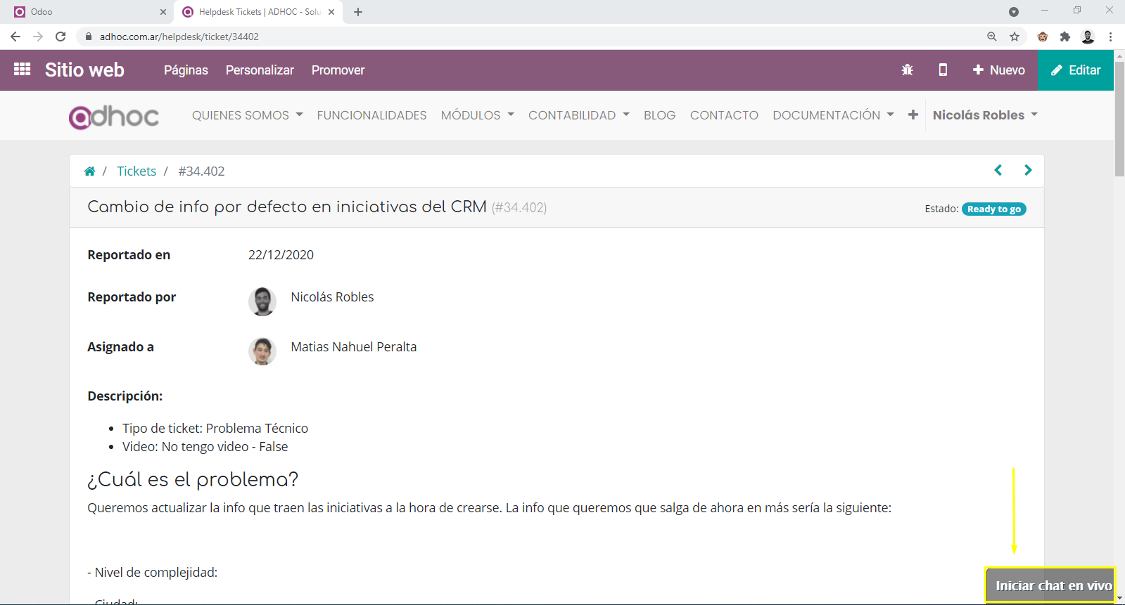 4) En el sector inferior derecho veremos la opción de "Iniciar chat en vivo" por el cual vamos a poder chatear en vivo con el equipo de mesa de ayuda de Adhoc.