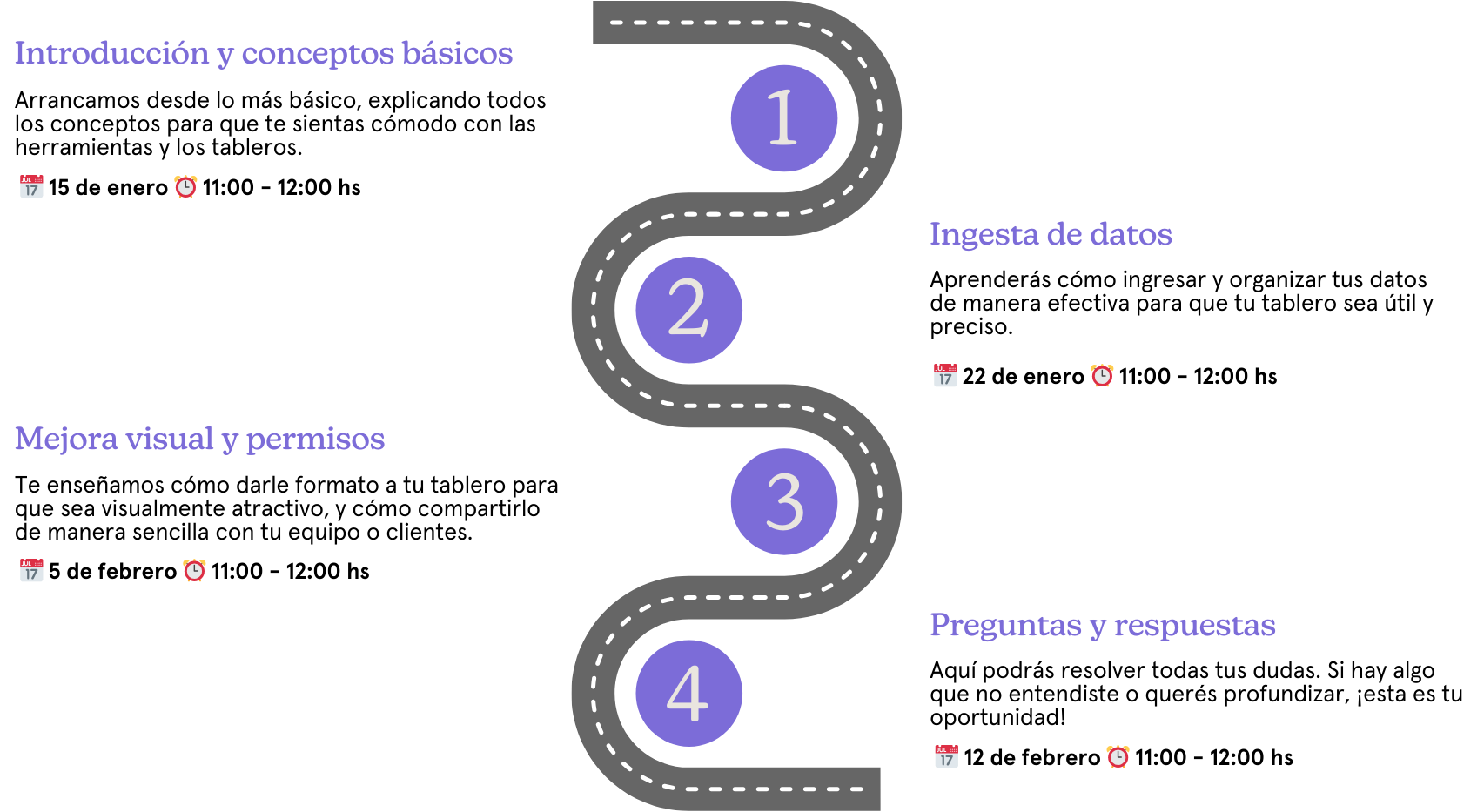 En solo 4 horas vas a aprender cómo armar tableros prácticos que realmente te sirvan, y no solo eso, también vas a tener la oportunidad de crearlos vos mismo durante el taller con la ayuda de José, crack de los tableros 😎