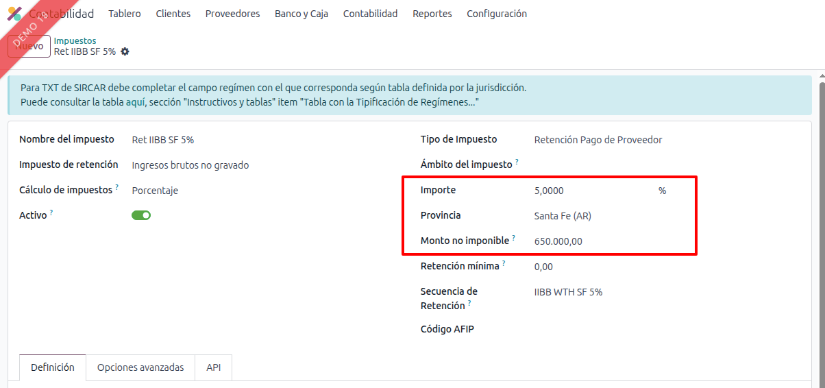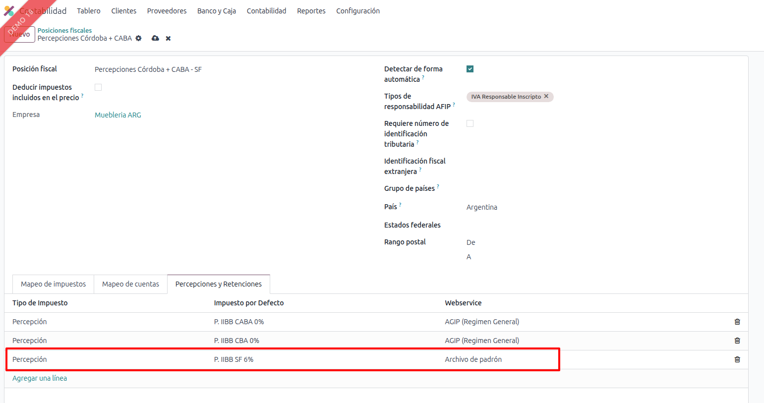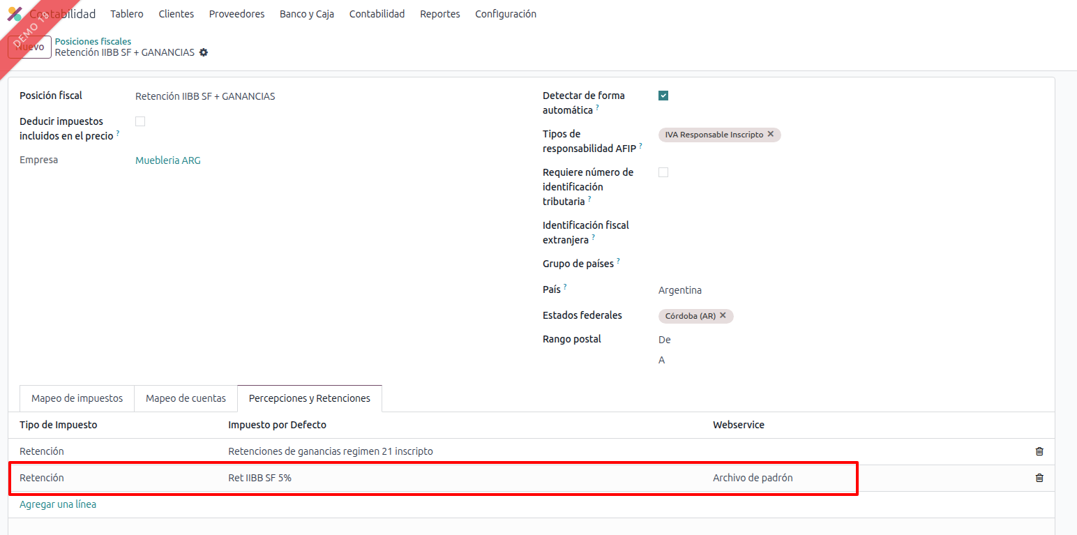 - Selecciona la posición fiscal correspondiente a Santa Fe (tanto para Percepciones como para Retenciones).
