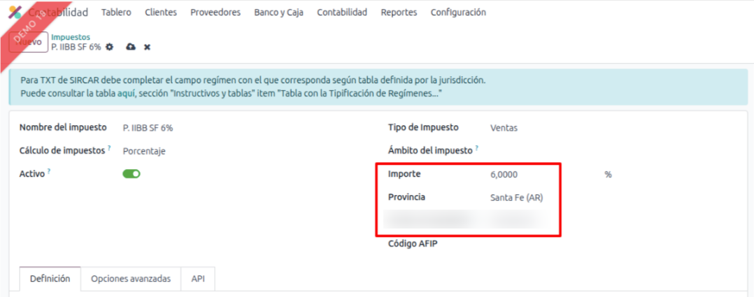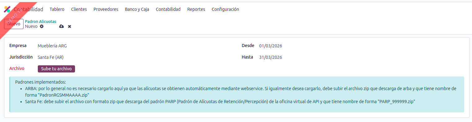 Antes de cargar el padrón, es fundamental verificar que los impuestos de la jurisdicción de Santa Fe estén correctamente configurados en "Contabilidad > Configuración > Impuestos".